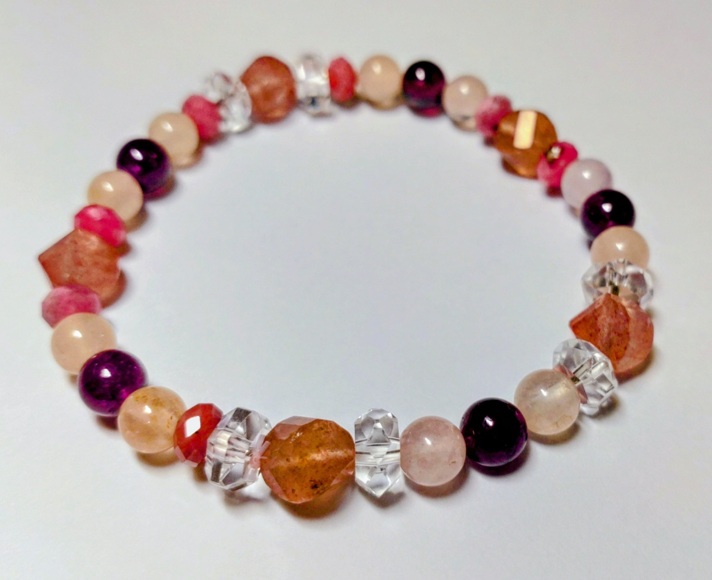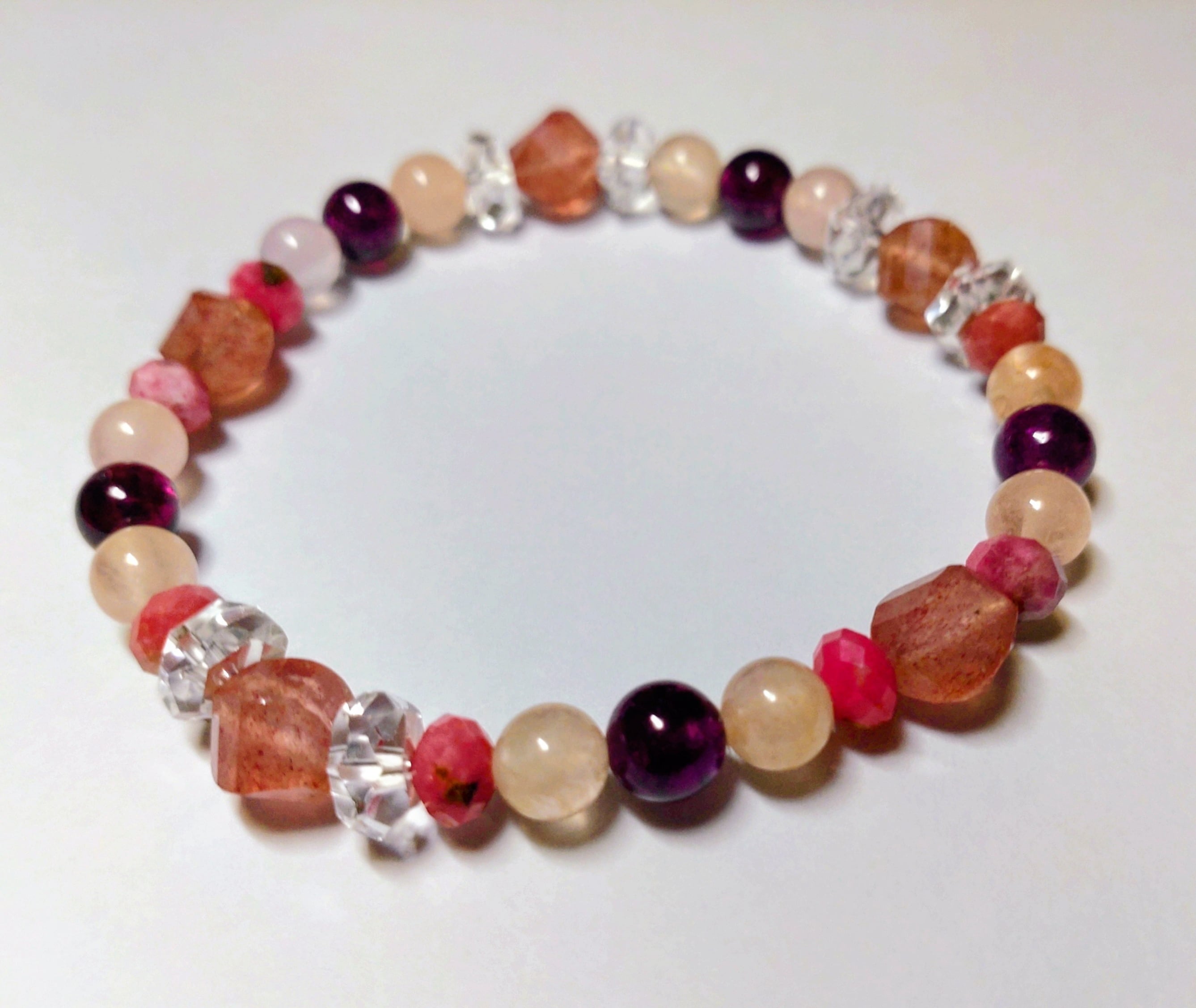 AA~AAAの高品質のロードナイト、モルガナイト、ロードライト・ガーネット等を贅沢に使用しています。6~8mmのストーンが中心です。普段使いで邪魔になりにくいジャストサイズです。