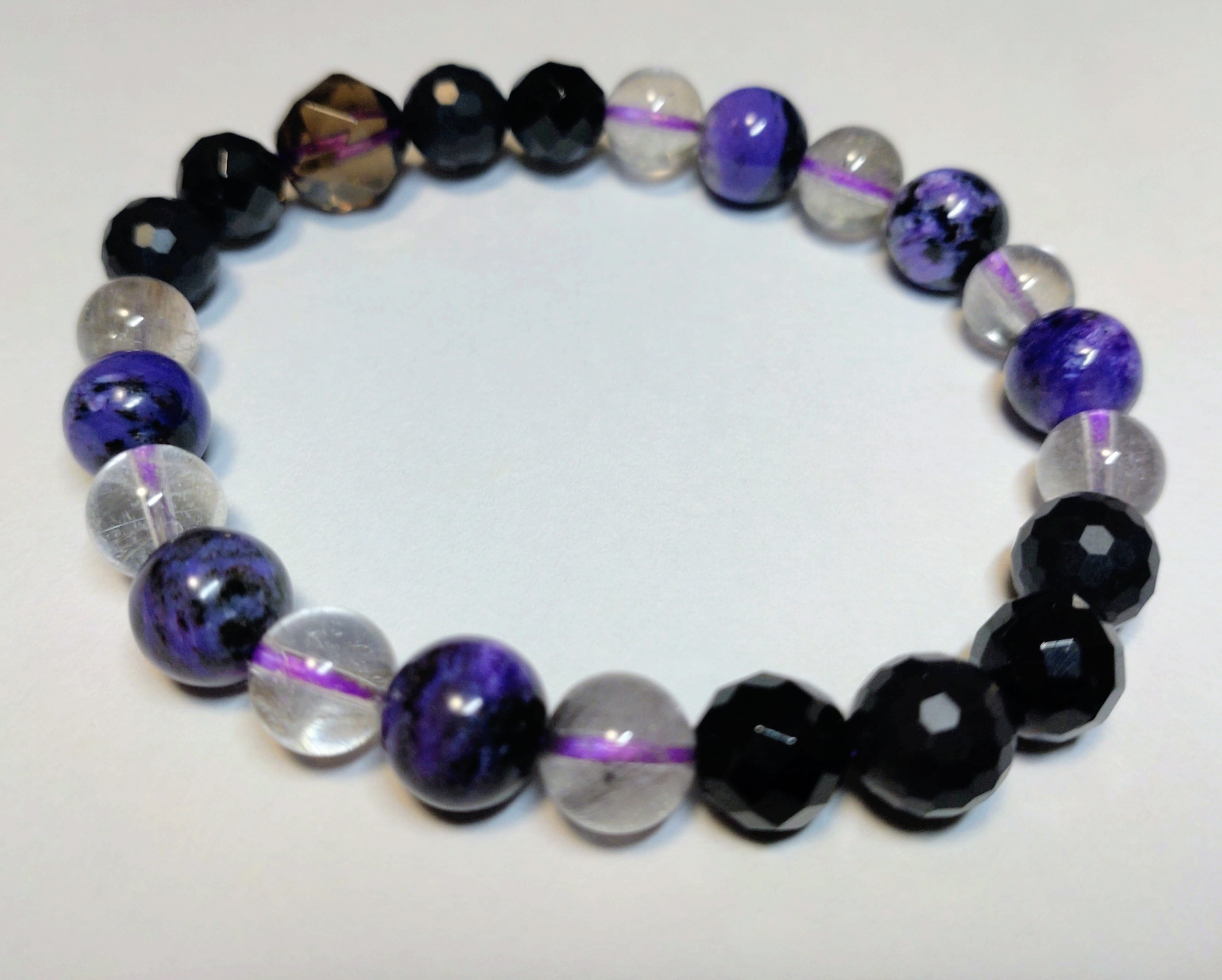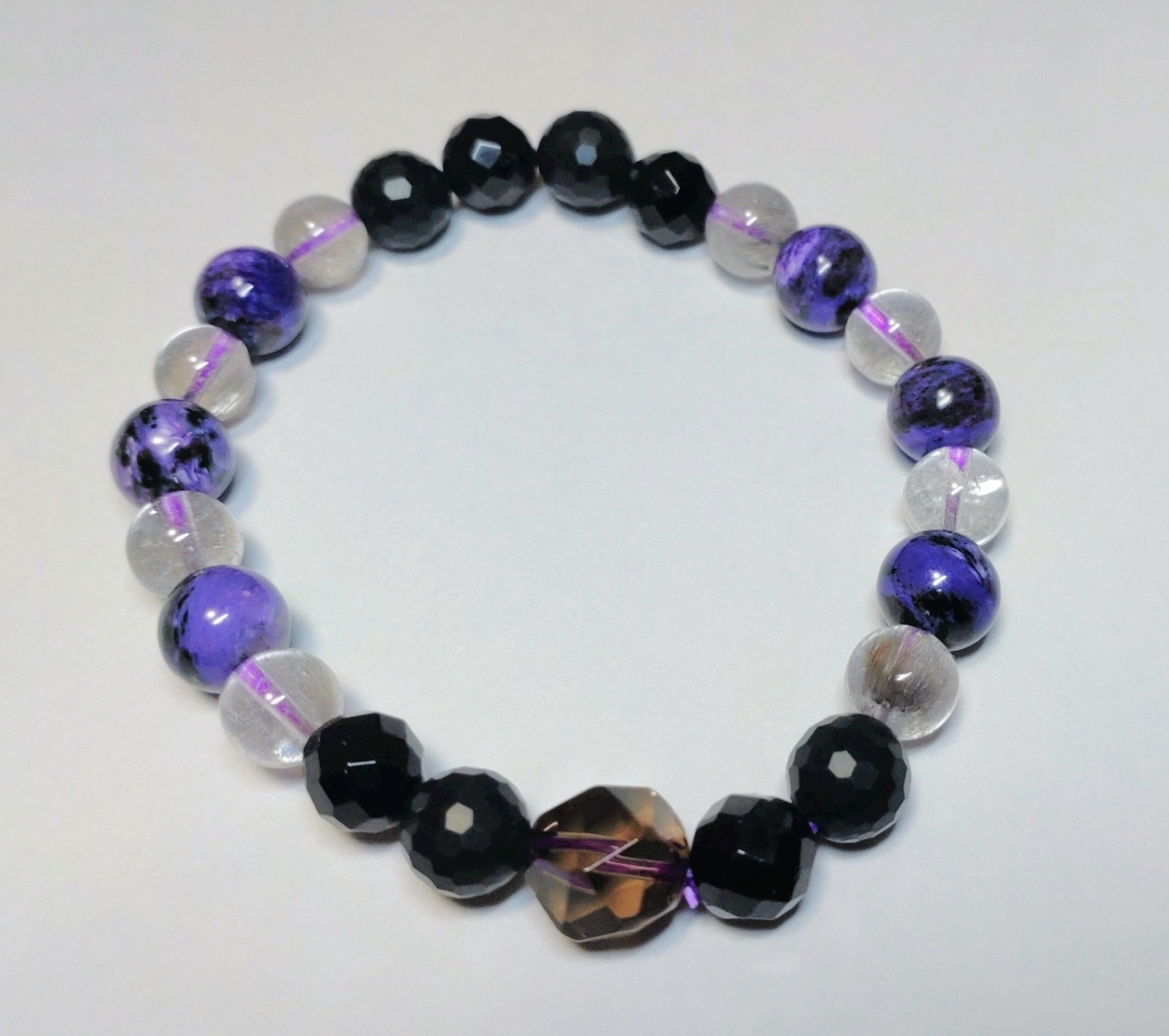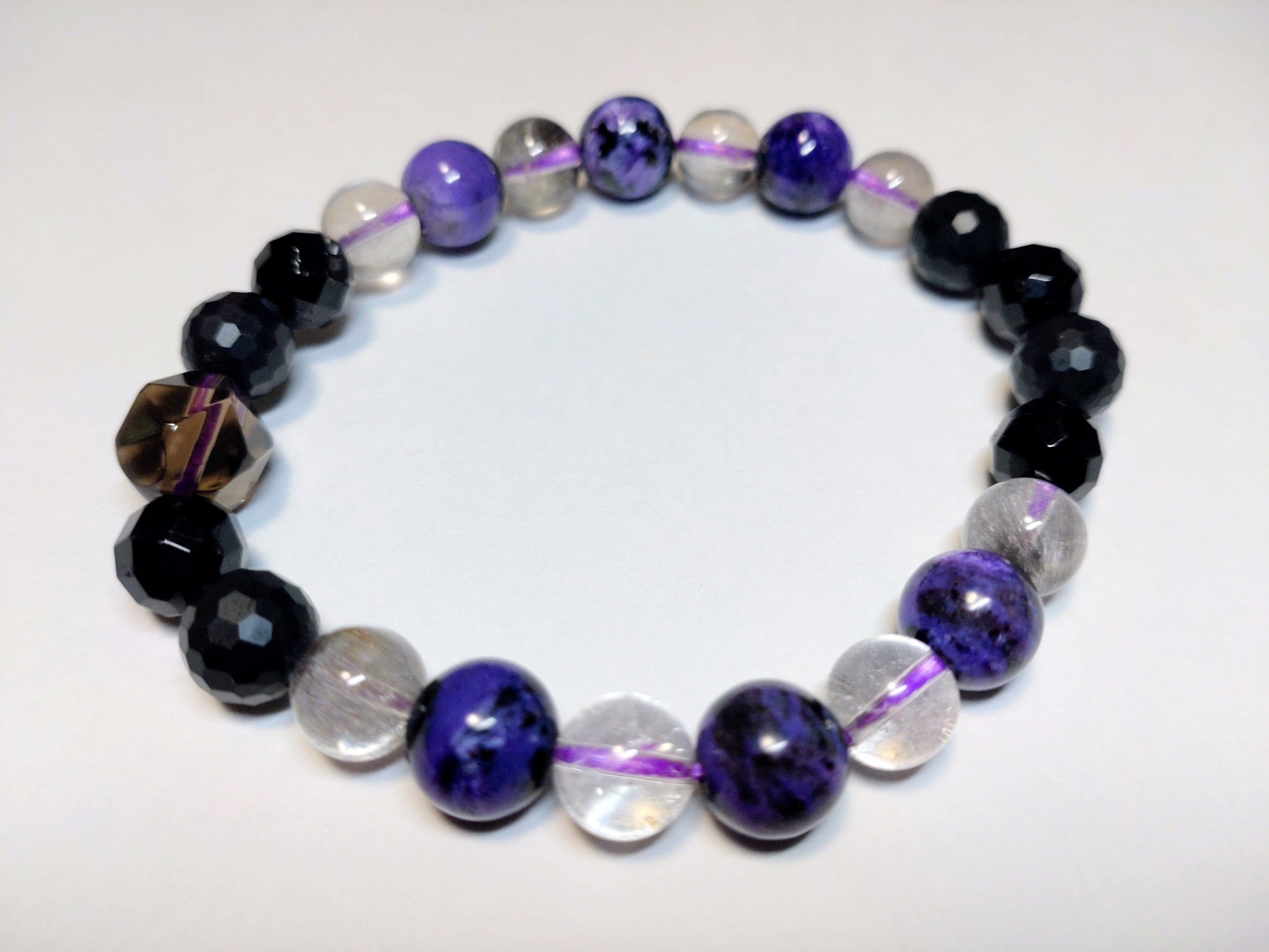 最強のグラウンディング力を有する「エジリン輝石」(=ブラックチャロアイト)、グラウンディング力の強い「ブラックトルマリン」を中心として、そこに意志力強化とセンタリング作用をもつ「プラチナルチル」を贅沢に使用しました。