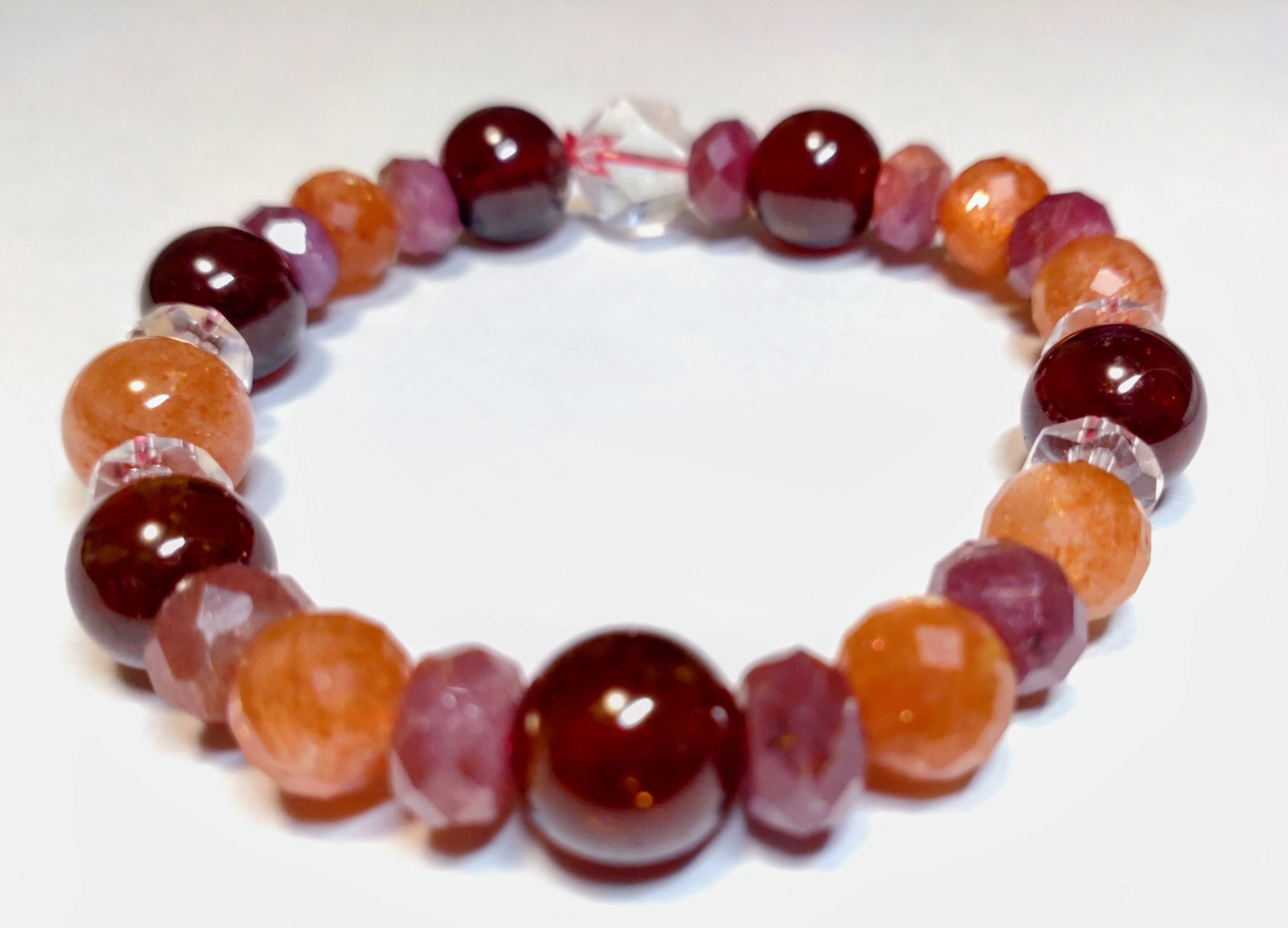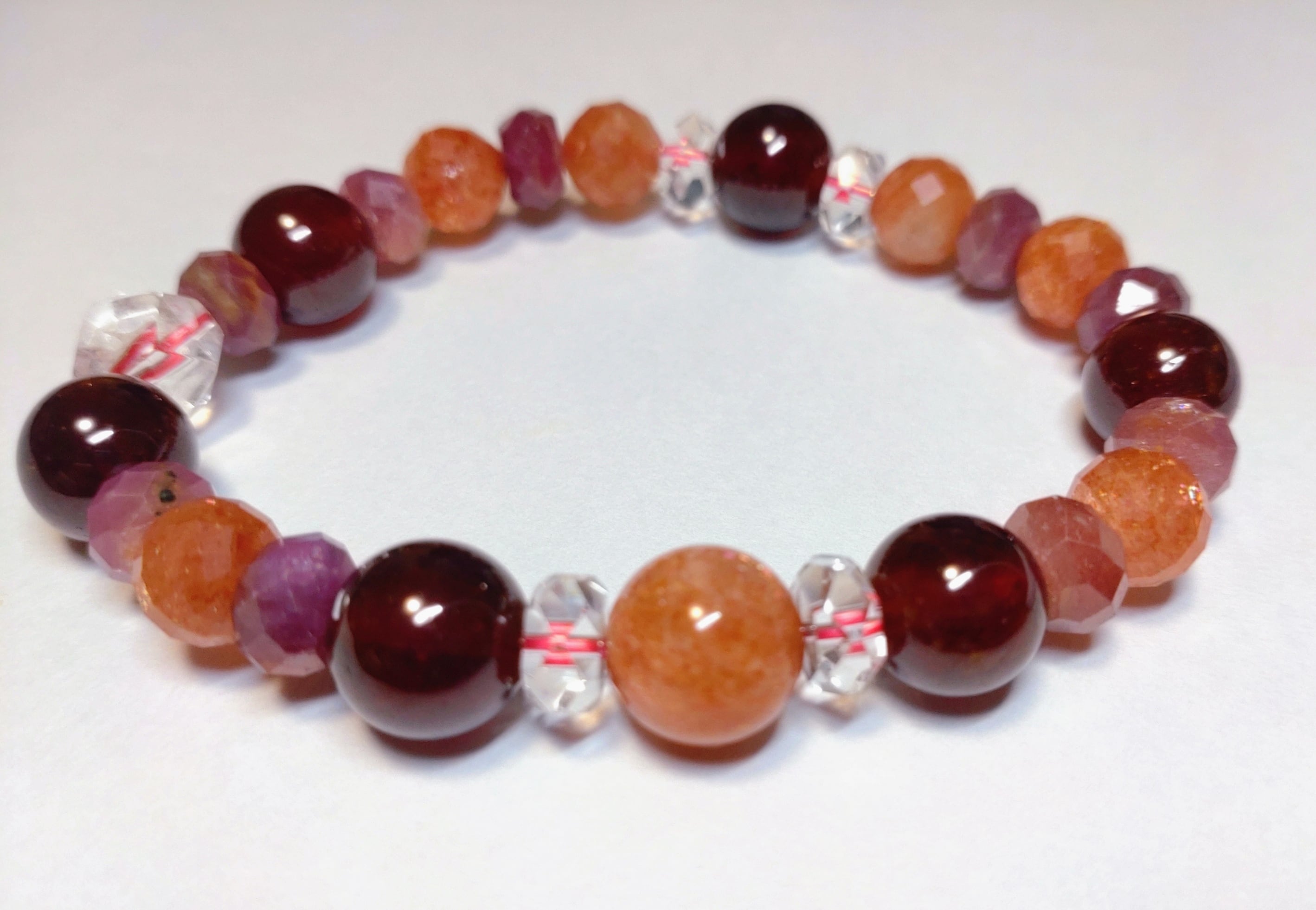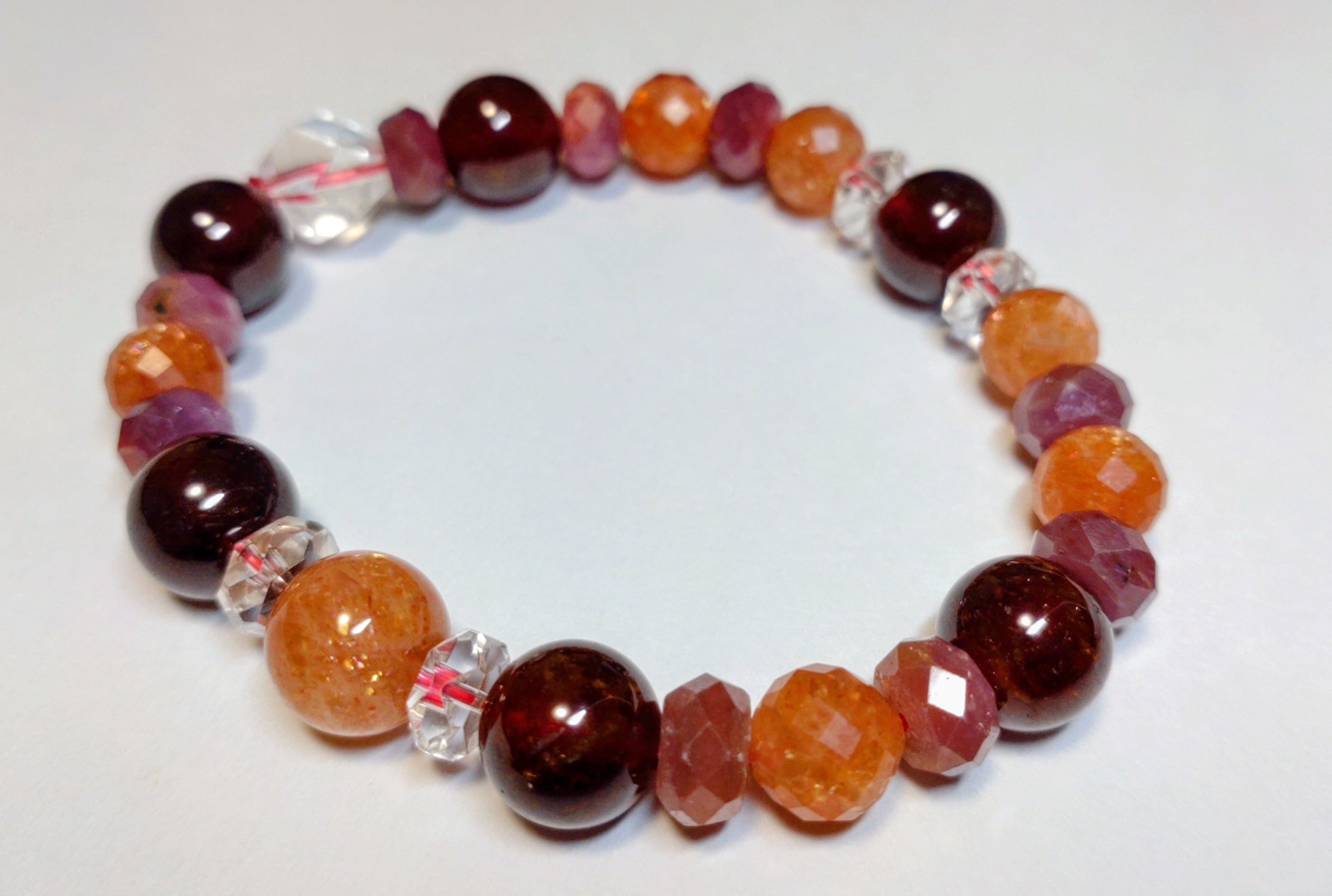 高品質なオレンジガーネット(ヘソナイト) × サンストーンを中心に、ルビー原石をコンビネーションさせた「1&2チャクラ強化」に特化した特別企画のブレスレットです。
