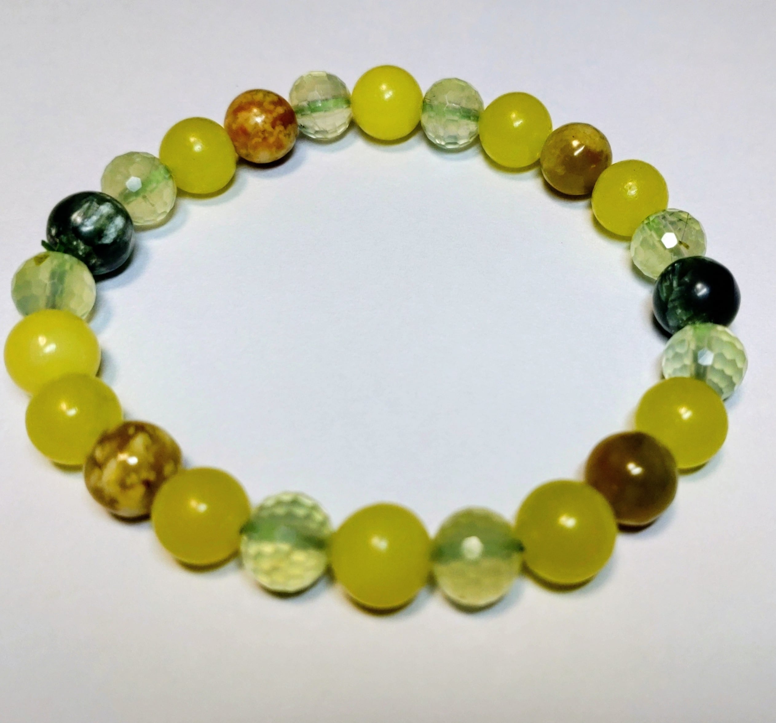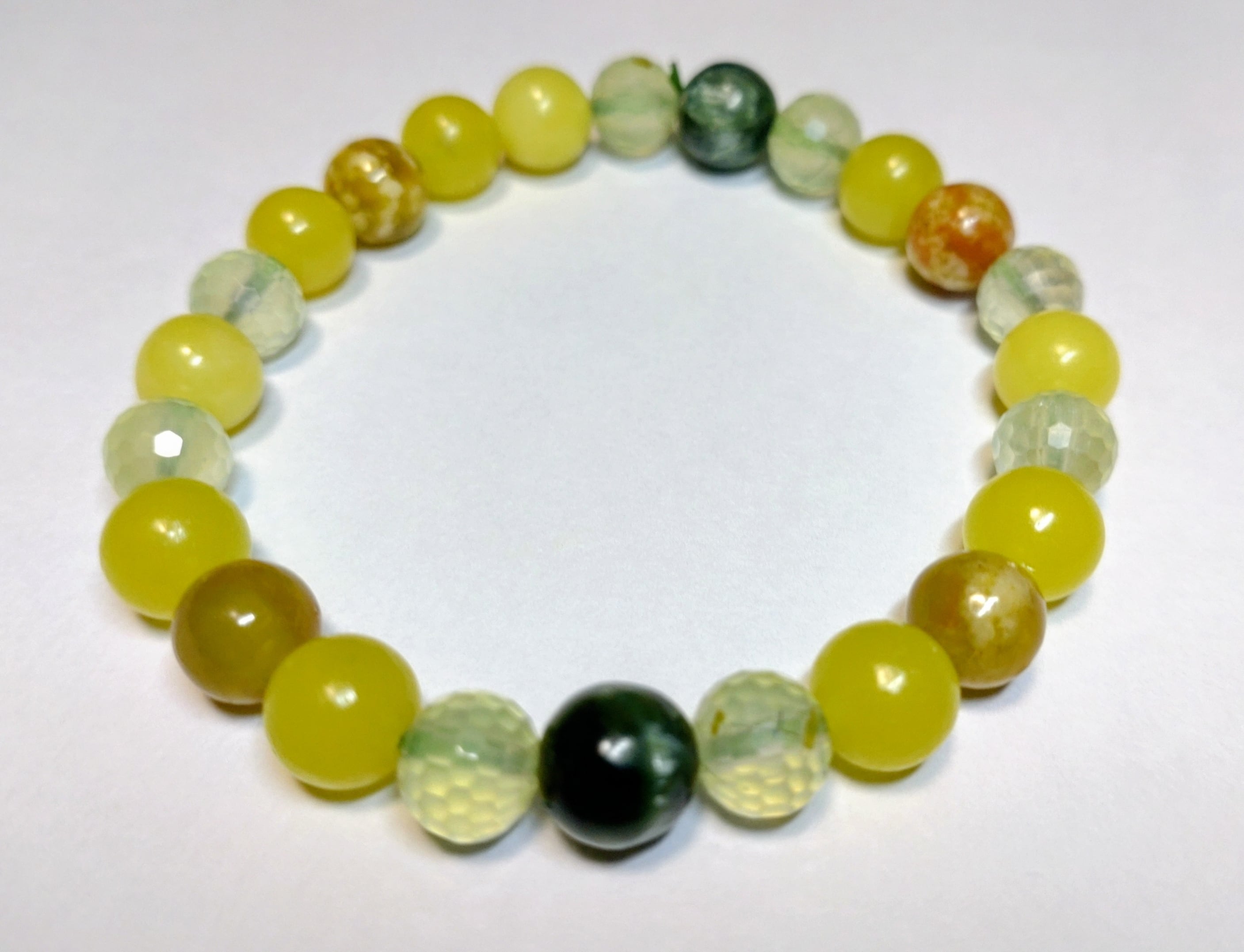 「海馬のチャクラ」に優先的に働きかけるオリーブジェード(ボーウェナイト)、サーペンティン(蛇紋岩)、プレナイト(葡萄石)を中心とした特別企画のブレスです。